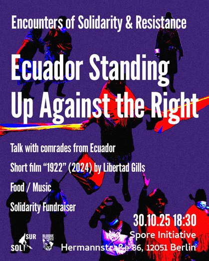 Angesichts des anhaltenden nationalen Streiks und der alarmierenden Menschenrechtslage in Ecuador möchte diese Veranstaltung in Berlin einen Raum für Solidarität und Reflexion schaffen. Ziel ist es, eine Brücke zwischen denjenigen zu schlagen, die in Ecuador für Gerechtigkeit kämpfen, und jenen, die aus der Ferne an ihrer Seite stehen wollen – ein Moment, um zuzuhören, sich auszutauschen und gemeinsam zu handeln.