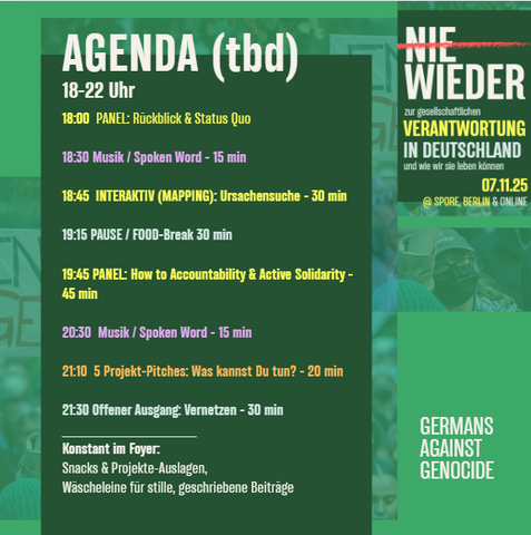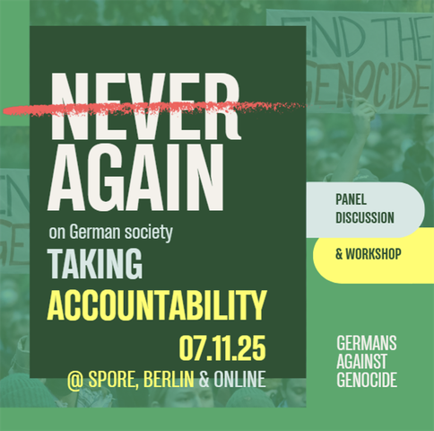 Es ist die Position von G.A.G., dass Deutschland steht erneut auf der Seite von Völkermord: Politik, Medien, Unternehmen und die Gesellschaft haben dies aktiv unterstützt oder stillschweigend ermöglicht. Gaza hat auf bittere Weise gezeigt, dass wir - entgegen der weit verbreiteten Selbstwahrnehmung - nicht gelernt haben, frühe Stadien eines Völkermords zu erkennen und laut und konsequent zu universellen Menschenrechten zu stehen.