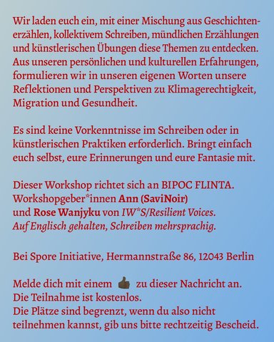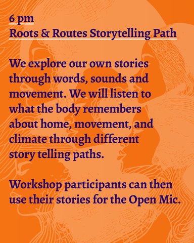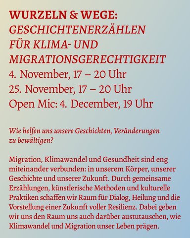 Migration, Klimawandel und Gesundheit sind eng miteinander verbunden: in unserem Körper, unserer Geschichte und unserer Zukunft. Durch gemeinsame Erzählungen, künstlerische Methoden und kulturelle Praktiken wurde ein Raum für Dialog, Heilung und die Vorstellung einer Zukunft voller Resilienz geschaffen. Dabei nutzen wir den Raum uns darüber austutauschen, wie Klimawandel und Migration unser Leben prägen. Teilnehmer*innen waren eingeladen, mit einer Mischung aus Geschichtenerzählen, kollektivem Schreiben, mündlichen Erzählungen und künstlerischen Übungen diese Themen zu entdecken.