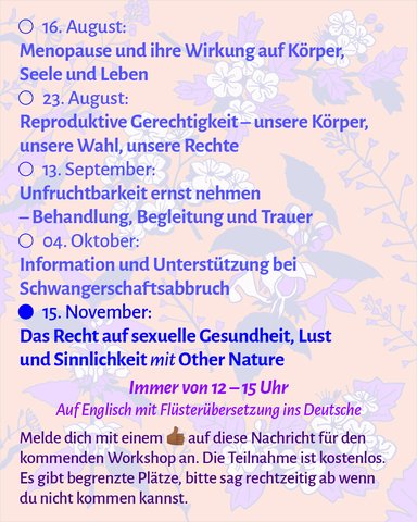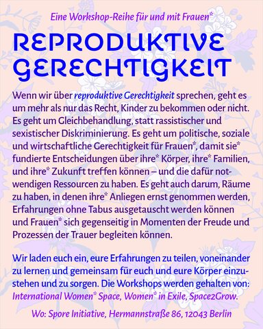 Wenn wir über reproduktive Gerechtigkeit sprechen, geht es um mehr als nur das Recht, Kinder zu bekommen oder nicht. Es geht um politische, soziale, rassische und wirtschaftliche Gerechtigkeit für Frauen*, damit sie* fundierte Entscheidungen über ihren Körper, ihre Familien und ihre Zukunft treffen können – und die dafür notwendigen Ressourcen zu haben. Es geht auch darum, Räume zu haben, in denen ihre* Anliegen ernst genommen werden, Erfahrungen ohne Tabus ausgetauscht werden können und Frauen* sich gegenseitig in Momenten der Freude und Prozessen der Trauer begleiten können.