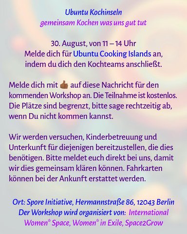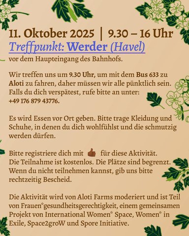 Die Aktivität wurde von Aloti Farms moderiert und ist Teil von Frauen*gesundheitsgerechtigkeit, einem gemeinsamen Projekt von International Women* Space, Women* in Exile, Space2Grow und Spore Initiative.