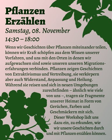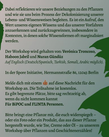 Wenn wir Geschichten über Pflanzen miteinander teilen, können wir Kraft schöpfen aus dem Wissen unserer Vorfahren, und uns mit den Orten in denen wir aufgewachsen sind sowie unseren unseren Migrationserfahrungen verbinden. Pflanzen zeigen Geschichten von Extraktivismus und Vertreibung, sie verkörpern aber auch Widerstand, Anpassung und Heilung. Während sie reisen und sich in neuen Umgebungen zurechtfinden – ähnlich wie viele von uns –, tragen sie Fragmente unserer Heimat in Form von Gerüchen, Farben und Geschmäckern mit sich. Dieser Workshop lud Teilnehmer*innen dazu ein, zu erkunden, wie wir unsere Geschichten durch und mit Pflanzen erzählen können. Dabei reflektierten wir unsere Beziehungen zu den Pflanzen und wie sie uns beim Prozess der Dekolonisierung unserer Lebens- und Wissensweisen begleiten. Es ist ein Aufruf, den Wert unseres eigenen Wissens und das unserer Vorfahren anzuerkennen und zurückzugewinnen, insbesondere in Kontexten, in denen solche Wissensformen oft marginalisiert werden.