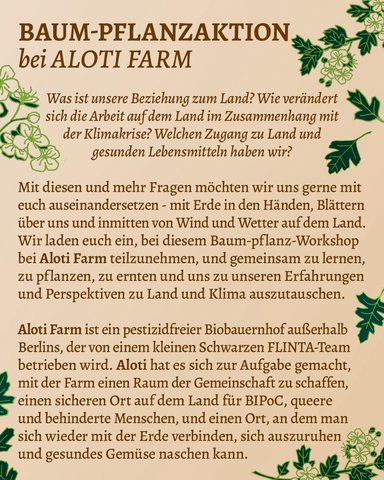 Bei diesem Baum-pflanz-Workshop bei Aloti Farm haben wir gemeinsam gelernt, gepflanzt und uns zu unseren Erfahrungen und Perspektiven zu Land und Klima ausgetauscht. Aloti hat es sich zur Aufgabe gemacht, mit der Farm einen Raum der Gemeinschaft zu schaffen, einen sicheren Ort auf dem Land für BIPoC, queere und behinderte Menschen, und einen Ort, an dem man sich wieder mit der Erde verbinden, sich auszuruhen und gesundes Gemüse naschen kann.