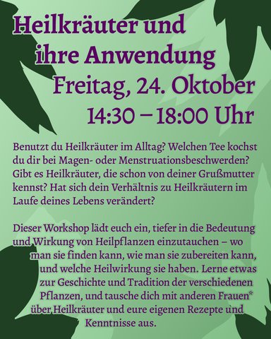 In diesem Workshop tauchten wir tiefer in die Bedeutung und Wirkung von Heilpflanzen ein – wo man sie finden kann, wie man sie zubereiten kann, und welche Heilwirkung sie haben. Wir erfuhren etwas zur Geschichte und Tradition der verschiedenen Pflanzen, und tauschten uns mit anderen Frauen* über Heilkräuter und ihre eigenen Rezepte und Kenntnisse aus.