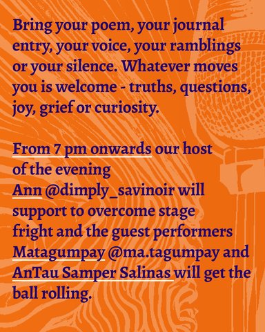 Dieser Open-Mic-Abend, moderiert von Ann Savoir, brachte Dichter*innen, Geschichtenerzähler*innen, Musiker*innen und Wortakrobat*innen in einem offenen und einladenden Rahmen zusammen, in dem jede* das Mikrofon ergreifen und ihre Gedanken, Texte und Lieder mit anderen teilen konnte. Einige der Geschichten, die wir zuvor in den Workshops gesammelt hatten – zu Themen wie sexuelle Gesundheit, Lust, Natur und Zugehörigkeit, Klima und Migration – wurden an diesem Abend präsentiert, zusammen mit den wunderbaren Darbietungen von Ann Savoir, Matagumpay, AnTau Samper Salinas, Camille Luc, Gulê Bulgurcu und spontanen Beiträgen aus dem Publikum von Jacky Njoki und Joyce Sabali.