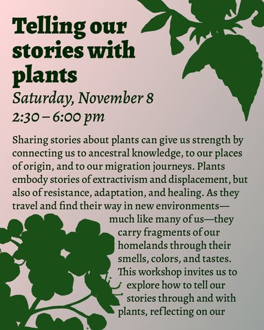 Sharing stories about plants can give us strength by connecting us to ancestral knowledge, to our places of origin, and to our migratory journeys. Plants embody stories of extractivism and displacement, but also of resistance, adaption and healing. As they travel and find their way in new environments – much like many of us – they carry fragments of our homelands through their smells, colors and tastes. This workshop invited participants to explore how to tell our stories through and with plants, reflecting on our relationship with them and how they accompany us in the process of decolonizing our ways of living and knowing. It is a call to recognize and reclaim the value of our own knowledge and that of our ancestors, especially within contexts where such wisdom is often marginalized.