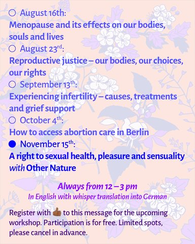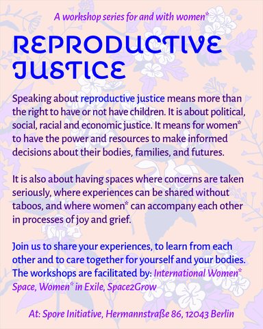 Speaking about Reproductive Justice means more than the right to have or not to have children. it is about political, social, racial and economic justice. It means for women* to have the power and resourcesto make informed decisions about their bodies, families and futures. It is also about having spaces where concerns are taken seriously, where experiences can be shared without taboos, and where women* can accompany each other in processes of joy and grief.