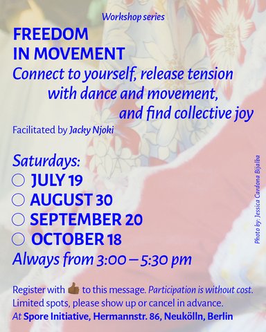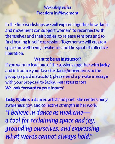 In the four workshops facilitated by Jacky Njoki & guests (Fariba Fazeli and Zeky) the participants in 2025 explored together how dance and movement can support women* to reconnect with themselves and their bodies, to release tensions and to find healing in self-expresssion. Together they created a space for well-being, resilience and the spirit of collective liberation.