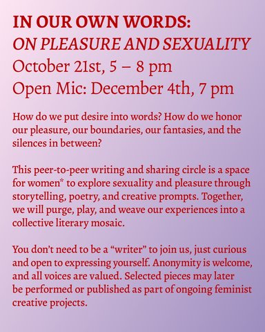 This peer-to peer writing and sharing circle was a space for women* to explore sexuality and pleasure through storytelling, poetry, and creative prompts. Together, we purged, played, and wove our experiences into a collective literary mosaic. People don’t need to be a “writer” to join us, just curious and open to expressing themselves. Anonymity is welcome, and all voices are valued. Selected pieces were later performed or published as part of ongoing feminist creative projects.