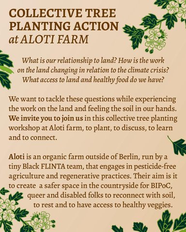 We invited participants to plant fruit trees together and support the organic farm Aloti run by a tiny Black FLINTA team near Berlin. Aloti centers BIPoC, queer, migrant and disabled folks in their farming practice and political work, but is open to all who share their values.