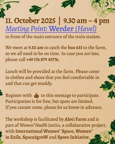 The workshop was facilitated by Aloti Farms and is part of Women*Health Justice, a collaborative project, with International Women* Space, Women* in Exile, Space2Grow and Spore Initiative.
