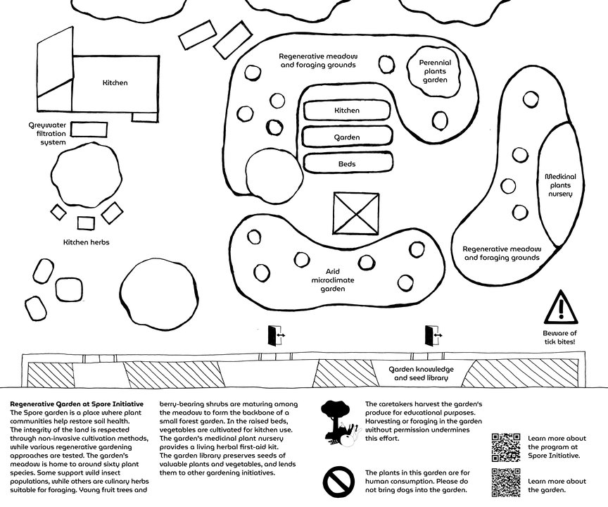 Der Garten der Spore ist ein Ort, an dem Pflanzengemeinschaften zur Wiederherstellung der Bodengesundheit beitragen. Die Integrität des Bodens wird durch nicht-invasive Anbaumethoden gewahrt, während verschiedene regenerative Gartenbauansätze getestet werden. Die Wiese des Gartens beherbergt rund sechzig Pflanzenarten. Einige unterstützen wilde Insektenpopulationen, während andere als Küchenkräuter zum Verzehr geeignet sind. Junge Obstbäume und beerenhaltige Sträucher wachsen auf der Wiese heran und bilden das Rückgrat eines kleinen Waldgartens. In den Hochbeeten werden Gemüse für den Küchengebrauch angebaut. Die Heilpflanzen-Gärtnerei des Gartens bietet eine lebende Erste-Hilfe-Apotheke. Die Gartenbibliothek bewahrt Samen wertvoller Pflanzen und Gemüsesorten auf und verleiht sie an andere Garteninitiativen.