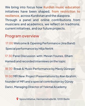 On 2 May 2026, Music For Identity gUG invites you to an evening exploring Kurdish music education between past, present, and future across Kurdistan and the diaspora, hosted at Spore Initiative in Berlin.